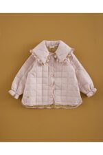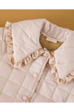 Trenka acolchada en color nude, cuello grande terminado en pico con volante en todo su alrededor del mismo tejido cuadro cinnamon.